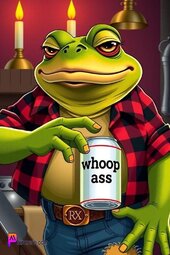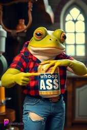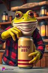 Prompt: A burly frog wearing a flannel shirt and torn jeans, smiling, opening a can that reads “whoop ass”, in his medieval style kitchen, two lanterns in background , bold and vibrant