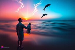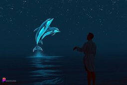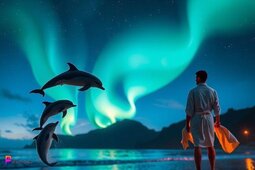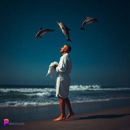 Prompt: Dolphins flying out of the water and headed up to the night sky, while a man in a bathrobe and holding a towel as he stands on the beach watching the dolphins