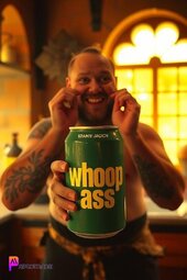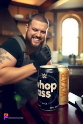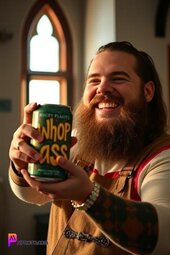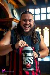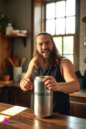 Prompt: Bray Wyatt, smiling, opening a can that reads “whoop ass”, in his medieval style kitchen, sun lighting through window, bold and vibrant