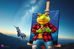 Prompt: Frog wearing a flannel shirt, torn jeans, painting on canvas, outside, starry sky, beautiful scenery, a unicorn in the background