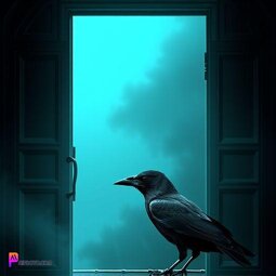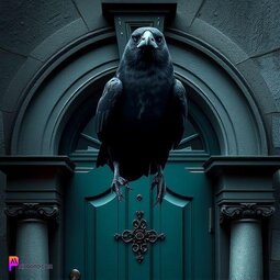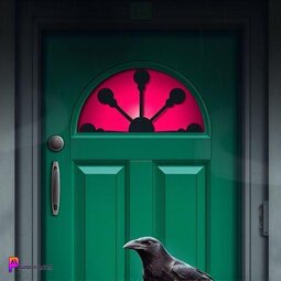 Prompt: A Raven perched over a green door, dark, stormy weather, gothic style