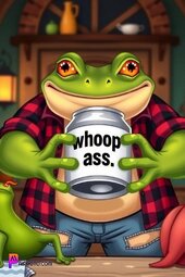Prompt: A burly frog wearing a flannel shirt and torn jeans, smiling, opening a can that reads “whoop ass”, in his medieval style kitchen, sun lighting through window, bold and vibrant