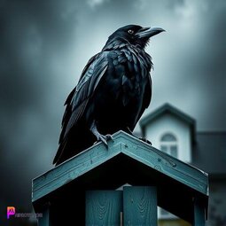 Prompt: A Raven perched on a house, over a green door, dark, stormy weather, gothic style
