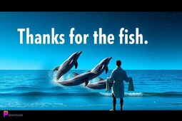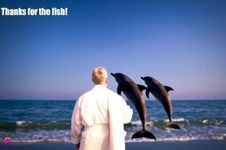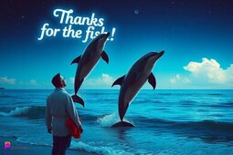 Prompt: Dolphins shooting straight up out of the water and headed up to the night sky, “Thanks for the fish!” Reads in the sky, while a man in a bathrobe and holding a towel as he stands on the beach watching the dolphins, digital glitch art style