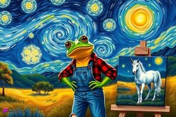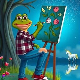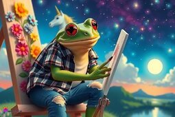 Prompt: Frog wearing a flannel shirt, torn jeans, is painting flowers on a canvas, starry sky, beautiful scenery, a unicorn in the background