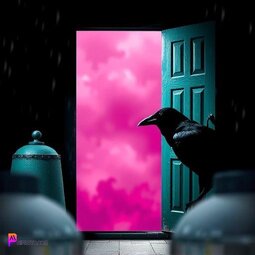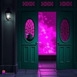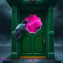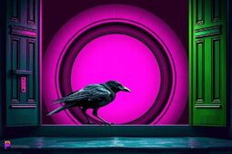 Prompt: A Raven peeking out from a green door, in front of a magenta portal, dark, stormy weather, gothic style