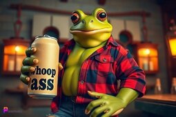 Prompt: A burly frog wearing a buttoned down flannel shirt and torn jeans, smiling, opening a can that reads “whoop ass”, in his medieval style tavern, two lanterns in background , bold and vibrant
