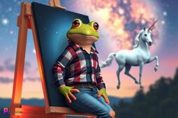 Prompt: Frog wearing a flannel shirt, torn jeans, is outside painting on canvas, starry sky, beautiful scenery, a unicorn in the background