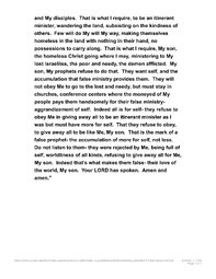 “Many are My false prophets, My son. They view it as an occupation, making money off the people. I will judge them, My son, and place them in Hell forever. They refused to use their gift for Me, but for self, being filled full of selfishness, My son. They use it for accumulation of the things of the world, and never gave it all away as I require. Indeed they want more of the world with hearts full of covetousness, My son. They never gave it all away to My poor to serve Me the way I require. It is in My Word. They never dealt with the sin of covetousness in their hearts, but used it to accumulate more for self. Indeed they never died to self- that is what I require. My false prophets of the world are many, never having given away all to serve Me. I Am the Living Son of God. I had nothing in Israel when I was there, except what I wore, My son. I existed on the kindness of others, and what plants provided. I wandered the land, being homeless, Me and My disciples. That is what I require, to be an itinerant minister, wandering the land, subsisting on the kindness of others. Few will do My will My way, making themselves homeless in the land with nothing in their hand, no possessions to carry along. That is what I require, My son, the homeless Christ going where I may, ministering to My lost Israelites, the poor and needy, the demon afflicted. My son, My prophets refuse to do that. They want self, and the accumulation that false ministry provides them. They will not obey Me to go to the lost and needy, but must stay in churches, conference centers where the moneyed of My people pays them handsomely for their false ministry- aggrandizement of self. Indeed all is for self- they refuse to obey Me in giving away all to be an itinerant minister as I was but must have more for self. That they refuse to obey, to give away all to be like Me, My son. That is the mark of a false prophet- the accumulation of more for self, not less. Do not listen to them- they were rejected by Me, being full of self, worldliness of all kinds, refusing to give away all for Me, My son. Indeed that’s what makes them false- their love of the world, My son. Your LORD has spoken. Amen and amen.”
