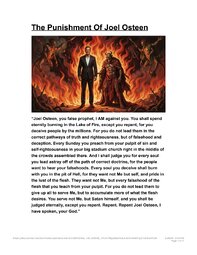 “Joel Osteen, you false prophet, I AM against you. You shall spend eternity burning in the Lake of Fire, except you repent, for you deceive people by the millions. For you do not lead them in the correct pathways of truth and righteousness, but of falsehood anddeception. Every Sunday you preach from your pulpit of sin and self-righteousness in your big stadium church right in the middle of the crowds assembled there. And I shall judge you for every soul you lead astray off of the path of correct doctrine, for the people want to hear your falsehoods. Every soul you deceive shall burn with you in the pit of Hell, for they want not Me but self, and pride in the lust of the flesh. They want not Me, but every falsehood of the flesh that you teach from your pulpit. For you do not lead them to give up all to serve Me, but to accumulate more of what the flesh desires. You serve not Me, but Satan himself, and you shall be judged eternally, except you repent. Repent. Repent Joel Osteen, I have spoken, your God."