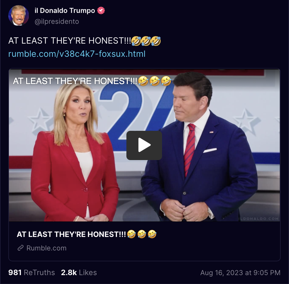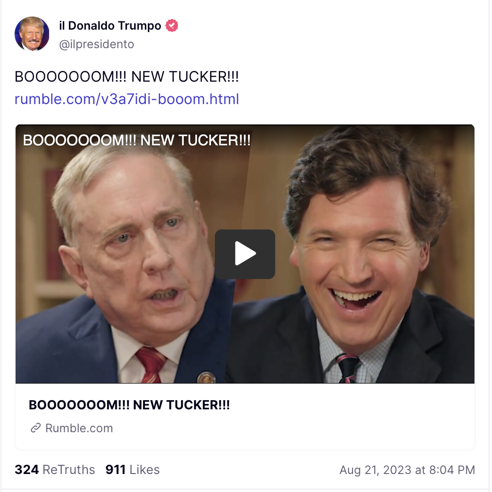 >>169189 Disclose.tv (T.me) NEW - Trump to skip first GOP debate for an interview with ex-Fox host Tucker Carlson.