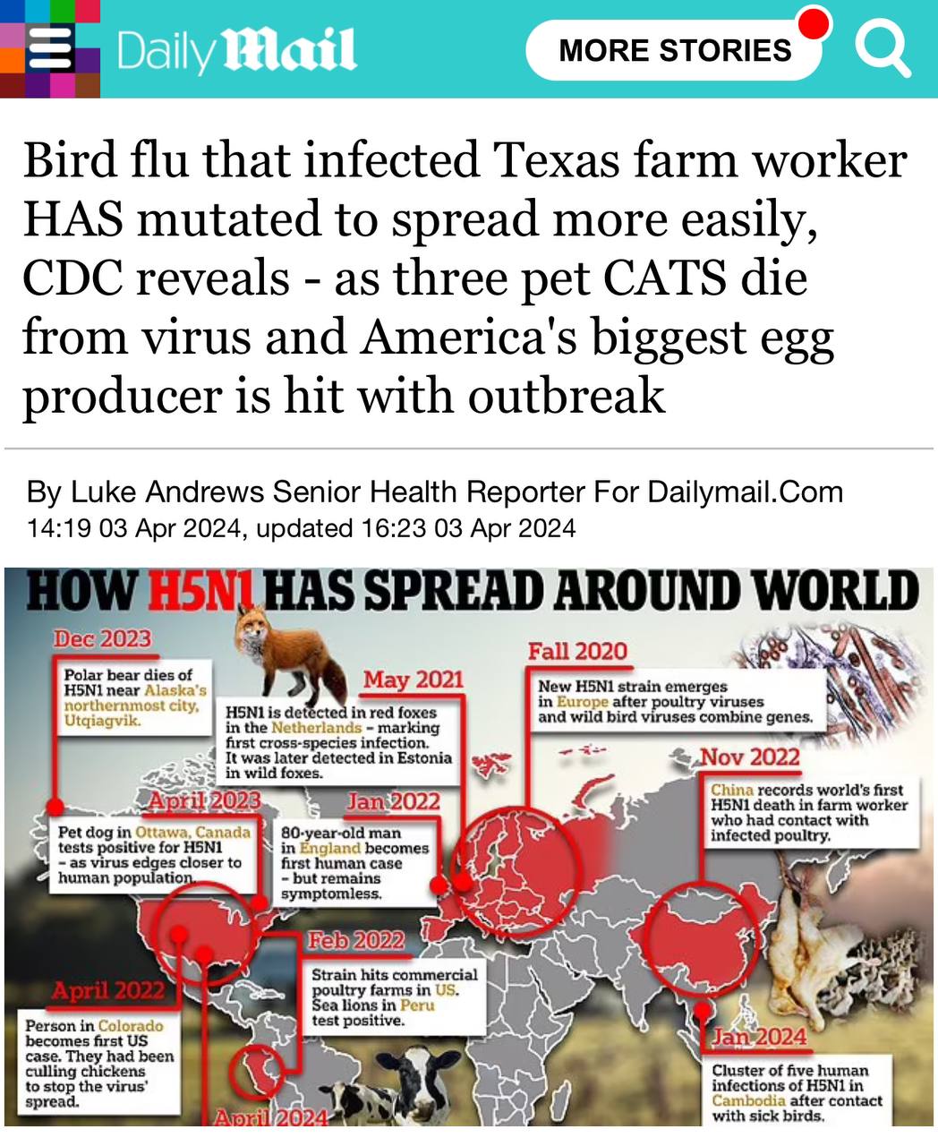 >>186083 InsiderPaper (NEW: Bird flu that infected Texas man has mutated to spread more easily, CDC reveals - as three pet cats die from virus and biggest egg producer in US is hit with outbreak report