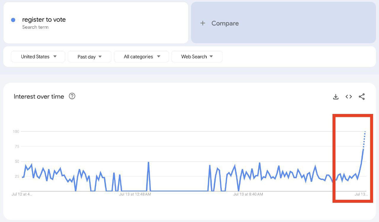 >>195121 CR (T.me) 👀🇺🇸 people searching register to vote has exponentially spiked after Trump's assassination attempt.