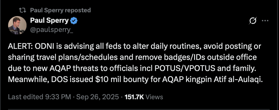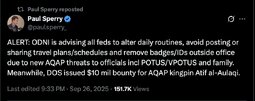 >>242305 PaulSperry (TwiX) ALERT: ODNI is advising all feds to alter daily routines, avoid posting or sharing travel plans/schedules and remove badges/IDs outside office due to new AQAP