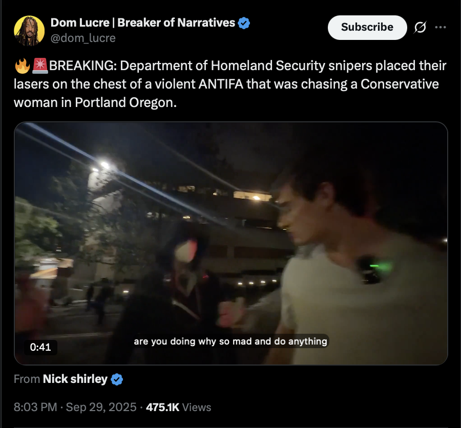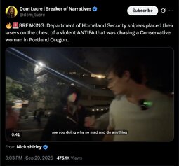 >>242260, >>242302 (TwiX) 🔥🚨BREAKING: Department of Homeland Security snipers placed their lasers on the chest of a violent ANTIFA that was chasing a Conservative woman in Portland Oregon.
