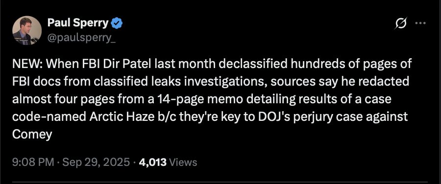 >>242190 PaulSperry (TwiX) UPDATE: Andrew McCabe just confirmed on CNN he has "not been interviewed" or even "contacted" by any agent or prosecutor working under FBI chief Patel or AG Bondi regarding the Comey perjury/obstruction case.