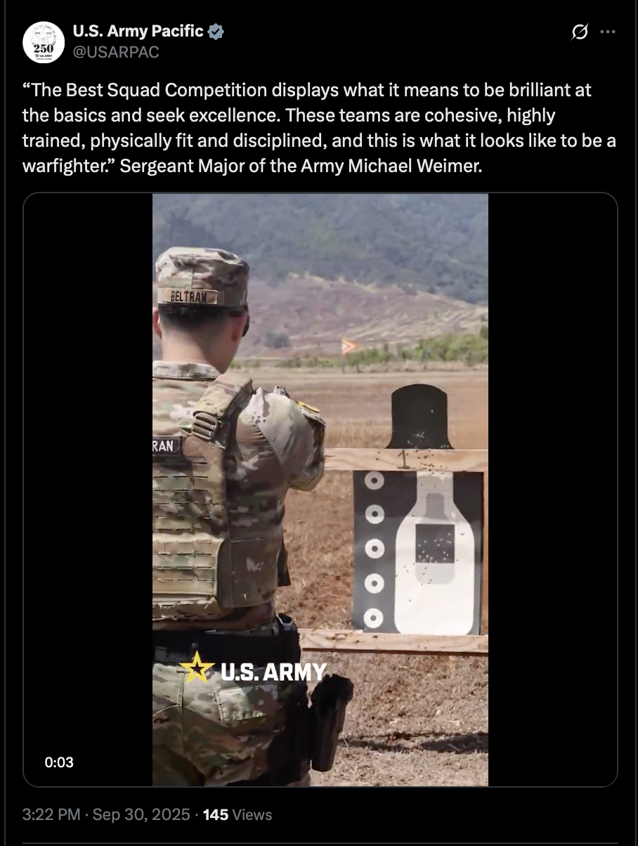 >>242297 USArmyPac (TwiX) “The Best Squad Competition displays what it means to be brilliant at the basics and seek excellence.