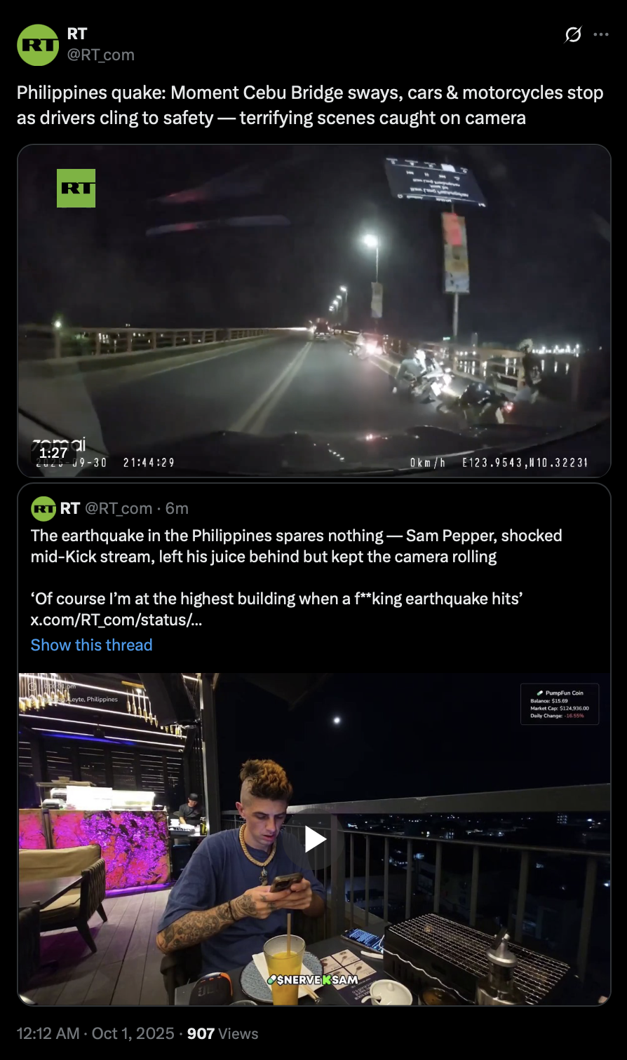 >>242306 RT (TwiX) Philippines quake: Moment Cebu Bridge sways, cars & motorcycles stop as drivers cling to safety — terrifying scenes caught on camera