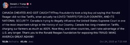 TS (T.me) The Ronald Reagan Foundation has just announced that Canada has fraudulently used an advertisement, which is FAKE, featuring Ronald Reagan speaking negatively about Tariffs. The ad was for $75,000. They only did this to interfere with the decision of the U.S. Supreme Court, and other courts. TARIFFS ARE VERY IMPORTANT TO THE NATIONAL SECURITY, AND ECONOMY, OF THE U.S.A. Based on their egregious behavior, ALL TRADE NEGOTIATIONS WITH CANADA ARE HEREBY TERMINATED. Thank you for your attention to this matter! President DJT