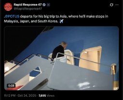 >>243377 TheWhiteHouse (TwiX) President Donald J. Trump arrives in Malaysia for the ASEAN Summit and is greeted by Prime Minister Anwar Ibrahim. 🇺🇸🇲🇾