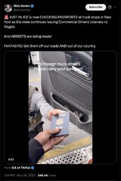 >>245206 NickSortor (TwiX) 🚨 JUST IN: ICE is now CHECKING PASSPORTS at truck stops in New York as the state continues issuing Commercial Drivers Licenses to illegals