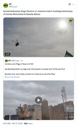 >>251227, >>251231 RT (TwiX) Iranian helicopter drops flowers on massive march marking anniversary of Islamic Revolution in Bandar Abbas