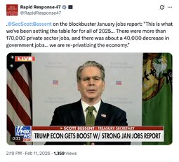 >>251257 RR47 (TwiX) .@SecScottBessent on the blockbuster January jobs report: "This is what we've been setting the table for for all of 2025… There were more than 170,000 private sector jobs, and there was about a 40,000 decrease in government jobs… we are re-privatizing the economy."