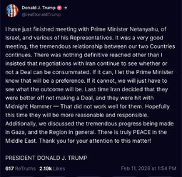>>251254 DJT (TruSoC) I have just finished meeting with Prime Minister Netanyahu, of Israel, and various of his Representatives.