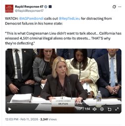 >>251239 RR47 (TwiX) WATCH: @AGPamBondi calls out @RepTedLieu for distracting from Democrat failures in his home state: "This is what Congressman Lieu didn't want to talk about… California has released 4,561 criminal illegal aliens onto its streets… THAT'S why they're deflecting."
