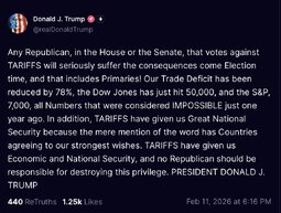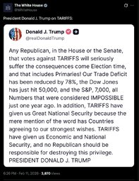 >>251294, >>251298 DJT (TruSoc) Any Republican, in the House or the Senate, that votes against TARIFFS will seriously suffer the consequences come Election time