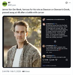 >>251267 RT (TwiX) James Van Der Beek, famous for his role as Dawson on Dawson’s Creek, passed away at 48 after a battle with cancer