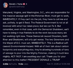 >>252055 GP (T.me) JUST IN: Trump Announces Poop Cleanup in Potomac River Nearly One Month into Major Sewage Spill That Flooded an Estimated 300 MILLION Gallons of Wastewater
