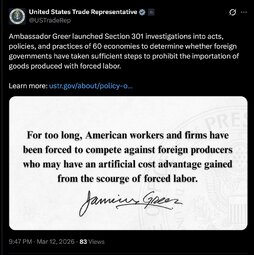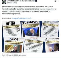>>255813 USTradeRepresentative (TwiX) Ambassador Greer announced the initiation of Section 301 investigations into acts, policies, and practices of various economies relating to structural excess capacity and production in manufacturing sectors.