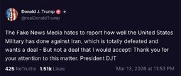 DJT (TwiX) The Fake News Media hates to report how well the United States Military has done against Iran, which is totally defeated and wants a deal - But not a deal that I would accept! Thank you for your attention to this matter. President DJT