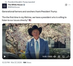 >>257606 TheWhiteHouse (TwiX) For 250 years, hardworking farmers, ranchers, and growers have nurtured our Nation’s abundant resources — feeding families, fueling communities, and sustaining the American people throughout every chapter of our national story.