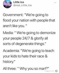 Whites surrendered 60 years ago, we accepted we were wrong and started parading MLK Jr, โContents of their character,โ and pushing for a colorblind America. Whites have been dedicated for decades to giving black people free money, preferred loans, education, etc. As each decade passed, white people became more radically tolerant, accepting lower standards of decorum, believing the black lived experience over statistics, dedicating billions of dollars and millions of man-hours to the improvement of the black race. All this while continually accepting more and more blame and demonization for past actions, all our efforts were not good enough. Under Biden, Whites agreed to accept loss of employment in favor of less qualified blacks and minorities, COVID relief to black businesses under a racial equity hierarchy, and our children being taught in school that their ancestors and race are evil, and so too are they inherently. The only reason Whites are waking up and standing up for themselves is because blacks and their Jewish thought leaders have been beating a defeated and surrendered enemy relentlessly for 60 years. The modern-day racists werenโt always racist. We werenโt taught to hate by a racist KKK grandpappy in the Appalachian South. We grew up as anti-racist and colorblind as the rest. Got called evil white devil 100 times and said โSorryโ 99 times. Now fuck it, Iโm the villain nigga, Heil Hitler.