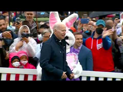 >The incident Trump referred to happened during the 2022 Easter Egg Roll hosted by then-President Biden. Biden was speaking with reporters before the Easter Bunny came in to usher the former president away.