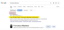 >A notable technical detail is that Google automatically activates its “SafeSearch” filter when users search for Francesca Albanese’s name. This feature is typically used to block explicit or violent content, which Albanese’s professional, rights-focused work does not contain.