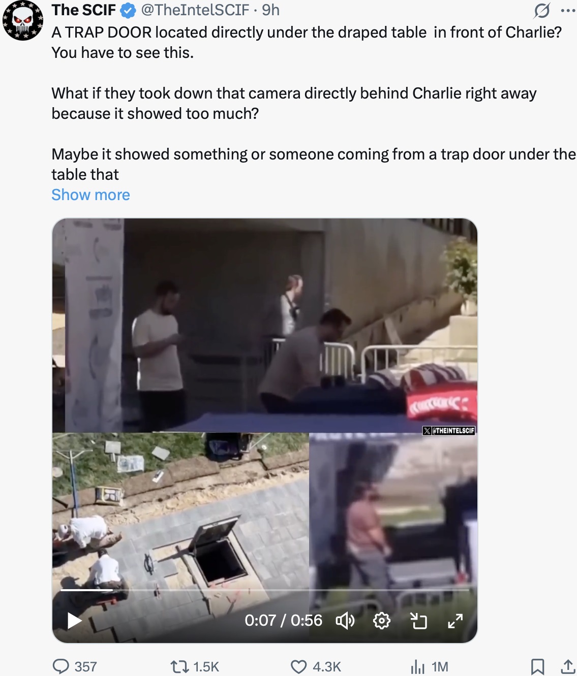 Watching the circus following the supposed assassination I wouldn't be surprised if Charlie did escape down that trapdoor lol. It's so crazy watching it all. Drumpf calling Charlie a master builder, so ridiculous.