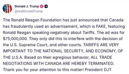 The Ronald Reagan Foundation has just announced that Canada has fraudulently used an advertisement, which is FAKE, featuring Ronald Reagan speaking negatively about Tariffs. The ad was for $75,000,000. They only did this to interfere with the decision of the U.S. Supreme Court, and other courts. TARIFFS ARE VERY IMPORTANT TO THE NATIONAL SECURITY, AND ECONOMY, OF THE U.S.A. Based on their egregious behavior, ALL TRADE NEGOTIATIONS WITH CANADA ARE HEREBY TERMINATED. Thank you for your attention to this matter! President DJT