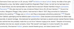 Germaine Greer was born on 29 January 1939[9] in Melbourne to a Catholic family, the elder of two girls followed by a boy. Her father called himself Eric Reginald ("Reg") Greer; he told her he had been born in South Africa, but she learned after his death that he was born Robert Hamilton King in Launceston, Tasmania.[10] She also learned he was christened Robert Henry Eric Ernest Hambert.[11] He and her mother, Margaret ("Peggy") May Lafrank, had married in March 1937; Reg converted to Catholicism before the wedding.[12] Peggy was a milliner and Reg a newspaper-advertising salesman.[13][c] Despite her Catholic upbringing and her father's open antisemitism, Greer became convinced that her father was secretly of Jewish heritage. She believed her grandmother had been a Jewish woman named Rachel Weiss, but admits that she probably made this up out of an "intense longing to be Jewish." Despite not knowing whether she had any Jewish ancestry, Greer "felt Jewish" and began to involve herself in the Jewish community. She learned Yiddish, joined a Jewish theatre group, and dated Jewish men.