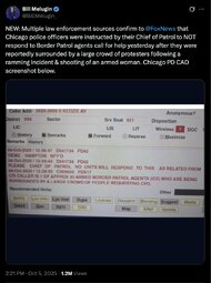 Originally posted at >>>/midnightriders/242576 (052329ZOCT25) Notable: (TwiX) NEW: Multiple law enforcement sources confirm to @FoxNews that Chicago police officers were instructed by their Chief of Patrol to NOT respond to Border Patrol agents