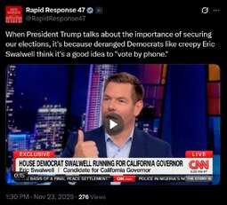 Originally posted at >>>/qresearch/23893208 (231832ZNOV25) Notable: When President Trump talks about the importance of securing our elections, it's because deranged Democrats like creepy Eric Swalwell think it's a good idea to "vote by phone."