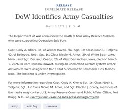 Originally posted at >>>/qresearch/24338123 (040417ZMAR26) Notable: Pentagon Identifies Four of Six U.S. Army Casualties During Iran Strikes / DoW Identifies Army Casualties