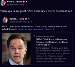 Originally posted at >>>/qresearch/24342916 (050542ZMAR26) Notable: NATO Chief Rutte to Newsmax: Trump's Iran Mission Has Broad Allied Support