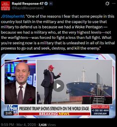 >>24549 , >>24550 Stephen Miller - What you're seeing now is a military that is unleashed in all of its lethal prowess to go out and seek, destroy, and kill the enemy.