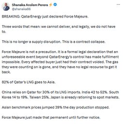 Qatar’s Emiri Air Force intercepts 7 Iranian ballistic missiles, 5 drones, and shoots down 2 manned Iranian aircraft in a single day. Then QatarEnergy shuts down all LNG production and declares Force Majeure on every contract.