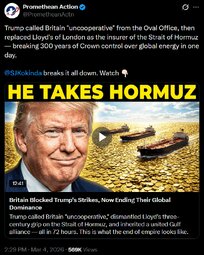 In this Wednesday update, Susan Kokinda argues that President Trump has openly ruptured with the UK over Iran, base access, and broader British policies on energy and immigration, while treating Germany under Chancellor Friedrich Merz as a more reliable partner and moving to cut trade with Spain over NATO and base issues. She says Britain blocked US use of Diego Garcia and other RAF bases for initial strikes, prompting Trump’s public criticism. Kokinda frames Lloyd’s of London’s decision to cancel war-risk coverage for Gulf shipping as a weapon of British imperial power, and highlights Trump’s response: directing the US Development Finance Corporation to provide political risk insurance and putting the Navy on notice to escort tankers through the Strait of Hormuz. She adds that Iranian strikes on Gulf neighbors pushed GCC states into condemning Iran and aligning more closely with the US.