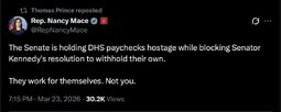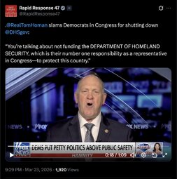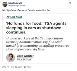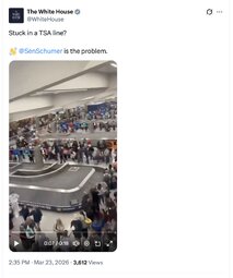 Originally posted at >>>/midnightriders/256121 (152127ZMAR26) Notable: TheWhiteHouse (TwiX) Democrats holding TSA officers hostage for political purposes is irresponsible and dangerous. Their work is critical to protecting our homeland and national security.