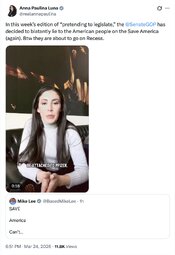 >>32084 AnnaPaulinaLuna (TwiX) In this week’s edition of “pretending to legislate,” the @SenateGOP has decided to blatantly lie to the American people on the Save America (again).